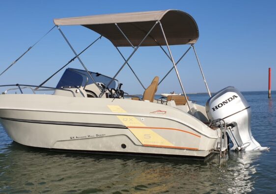 Dotazioni incluse nel prezzo: Salpa ancora elettrico, impianto 220 banchina con carica batterie, tendalino inox, telo completo, doppia batteria, pompa sentina, ecoscandaglio e GPS Simrad 7, impianto doccia, timoneria idraulica, gomma deck completo, impianto stereo, luci led pozzetto, wc chimico, motore Honda Marine BF100 158 ore di moto anno 2023.