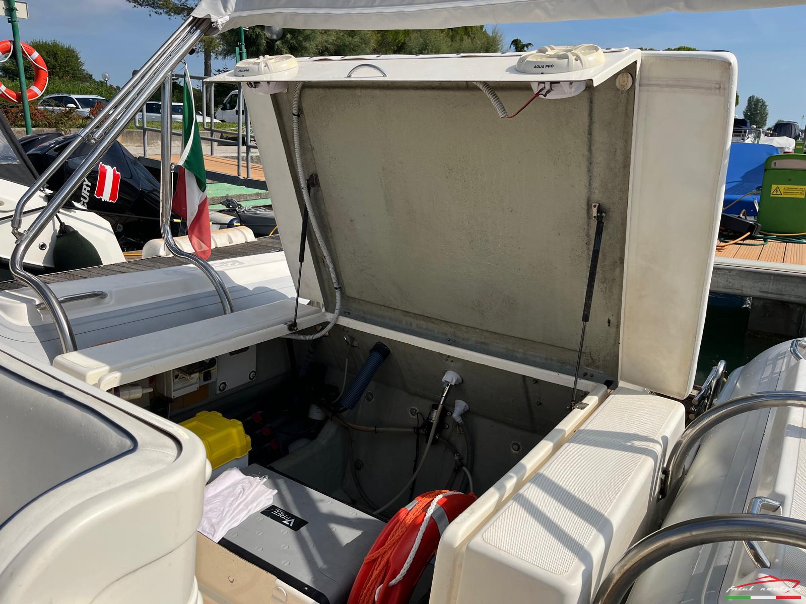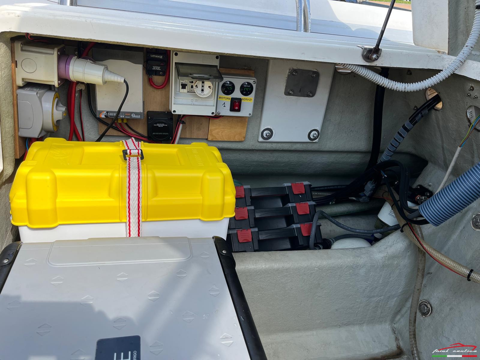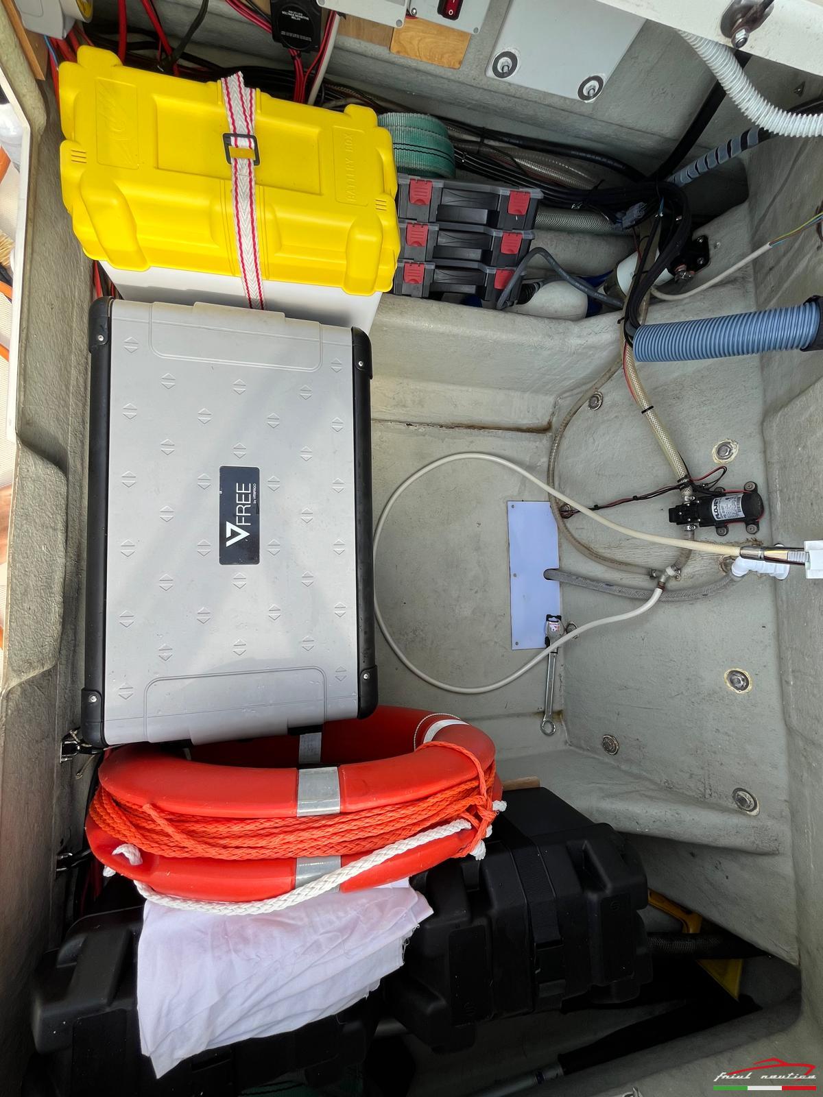 Gommone completo di: Cuscineria completa, telo invernale, telo copri consolle e copri seduta, Roll bar e tendalino anno 2024, salpa ancora elettrico con comando da consolle o con telecomando, ancora in acciaio inox con 30 mt di catena, 2 pompe di sentina, 3 batterie 100Ah cad (1 batteria per motore e 2 batterie per servizi), Frigo/freezer, GPS Garmin, Radio Fusion, VHF, serbatoio acqua 170 lt, 2 serbatoi carburante da 190lt cad (totale 380 lt) selezionabili separatamente per maggior sicurezza, dotazioni di bordo 12 Miglia, ciambella anulare, salvagenti, gonfiatore elettrico, autoclave e 2 doccette, timoneria idraulica. Manetta elettronica, strumentazione digitale.